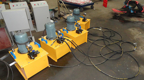 我公司生产的同步千斤顶质量上乘,设计有安全保压装置,内置卸压阀防止过载,?;でЫ锒ヒ岳诎踩僮鳌2⑸杓扑淖榻刂狗?,可随时控制千斤顶同步升与降。该装置的连接采用的是高压胶管和螺纹接头连接,具有使用安全便捷的优点,并克服传统快速接头漏油缺点,主要用于电力、建筑、机械制造、矿山、铁路桥梁、造船等多种行业的设备安装起顶拆卸作业。现已得到广大客户的认可,并与其成立友好合作关系,下图就是我公司给扬州某公司定制的同步千斤顶,已经全部生产完毕,在工程师的指导下,调试合格,现已包装完毕,准备发货。